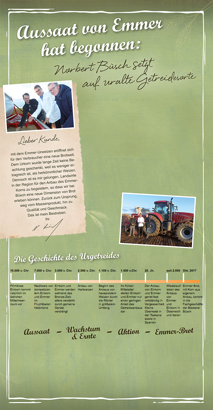 Bäckermeister Norbert Büsch hat ein Ziel: er will die uralte Getreidesorte „Emmer“ neu beleben. Und neue, attraktive Brot-Angebote daraus backen. Aber ganz so einfach ist das nicht, denn Emmer wird in Deutschland kaum noch angebaut. Mit Hilfe der Landwirtschaftskammer Rheinland beschaffte Norbert Büsch das erforderliche Saatgut und überzeugte acht Landwirte am Niederrhein und im Rheinland von seinem Plan. Jetzt begann die Aussaat.