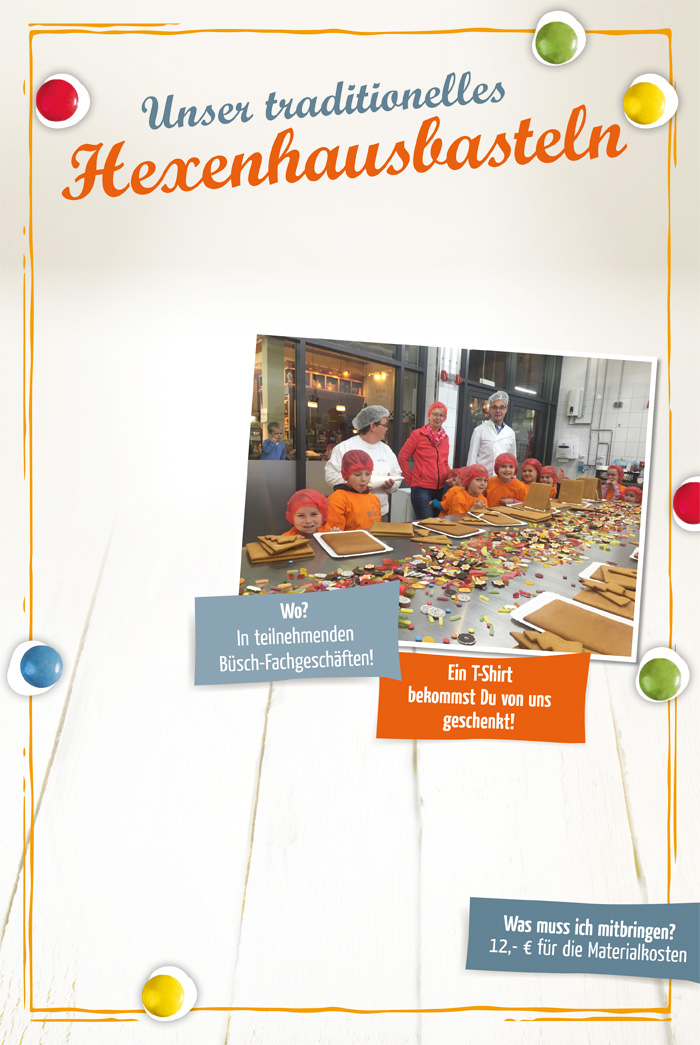 Vor Ort leitet dann eine „Hexe“ die Baumaßnahmen an und stattet jedes Kind direkt zu Beginn mit einem Büsch T-Shirt aus. Voraussetzung ist die Anmeldung des Kindes – und Platz am Wunschtermin im Fachgeschäft. Aber nicht nur einzelne Kinder können ihre Hexenhäuser bauen, ganze Schulklassen und Kindergärten freuen sich schon darauf. Wir planen rund 190 Basteltermine, an denen insgesamt 3.000 Kinder teilnehmen werden.