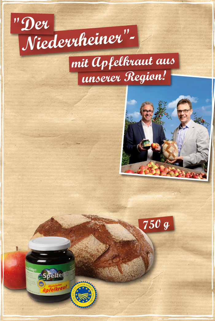 Die Kinder vergangener Jahrhunderte müssen es geliebt haben: Auf fast jedem Bauernhof am Niederrhein wurde früher Apfelkraut gemacht – nach einem ganz einfachen Rezept. Man presste gekochte Äpfel und Birnen und dickte ihren Saft so lange ein, bis er dunkelbraun und ganz süß wurde. Für Leckermäuler war das damals eine der wenigen Möglichkeiten, Obst zu konservieren und im Winter genießen zu können. Auch heute noch wird es von vielen Liebhabern nachgefragt, unter anderem in der Spitzengastronomie. Hergestellt wird das Apfelkraut aber nur noch von wenigen Traditionsunternehmen. Zu ihnen zählt die kleine Fabrik von Bernd Spelten aus Wegberg. Spelten versteht das Apfelkraut als jahrhundertealtes Naturprodukt, das in seiner ursprünglichen Qualität erhalten bleiben soll. Und genau dieses Traditionsbewusstsein verbindet Bernd Spelten und Norbert Büsch. Gemeinsam bringen sie – nach bewährtem Rezept von Oma Christa Büsch – das Apfelkraut in ganz neuer Form auf den Tisch: in einem saftigen Brot aus Weizenmehl, Roggenmehl, Sauerteig, Apfelkraut, Salz und Hefe. Nach traditionellem Handwerk gebacken entsteht aus diesen guten Zutaten „Der Niederrheiner“.