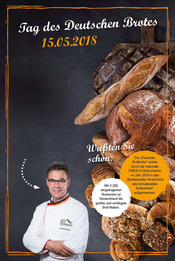 Am 15.05.2018 ist der Tag des Deutschen Brotes. Das nationale Bäckerhandwerk feiert zum sechsten Mal das Deutsche Brot mit einem großen Fest in Berlin aber auch in ganz Deutschland in den Bäckereien.