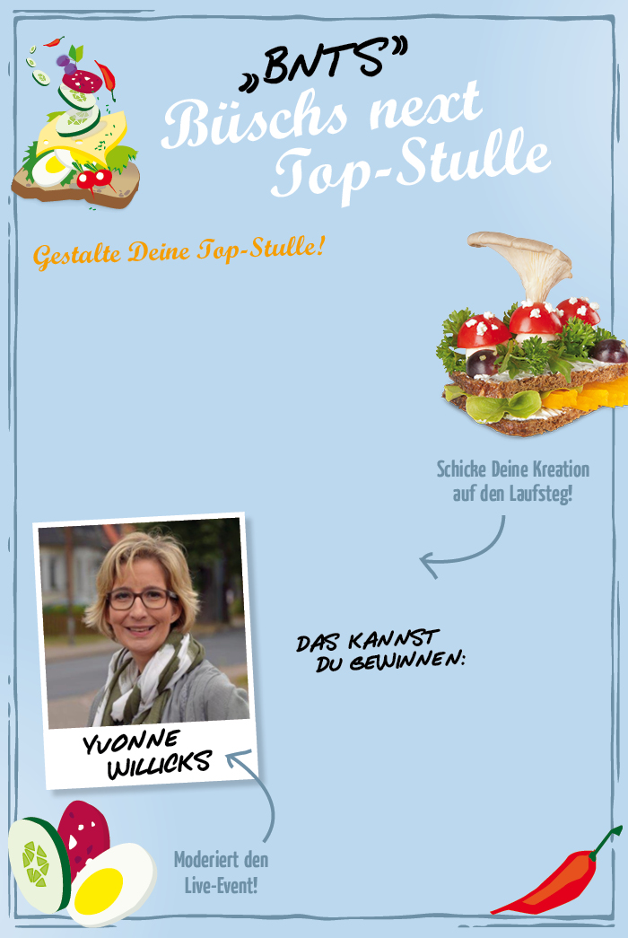 voten. Nur die zwölf Besten, deren Bilder die meisten "Gefällt-mir"-Klicks bekommen, werden zu einem Live-Event am 30.09. eingeladen. Dort treten sie im Wettbewerb gegeneinander an und beweisen ihre Kreativität. Eine prominent besetzte Jury, bestehend aus Herrn Büsch und Frau Hofrichter, ermittelt dann „Büschs next Top-Stulle“ – auf den Sieger warten tolle Preise.