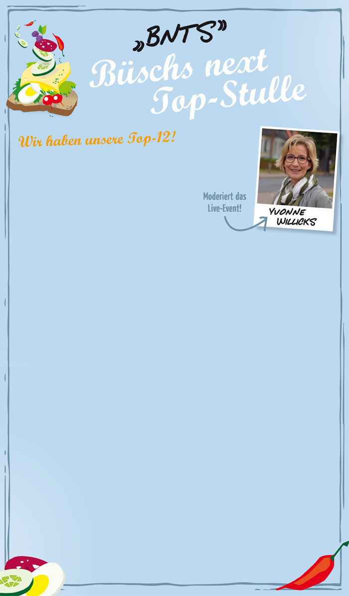 Die zwölf Teilnehmer, die die meisten “Gefällt mir"-Klicks auf unserer Facebookseite facebook.com/BueschTopStulle2016 für ihre Stullen bekommen haben, werden bei einem Live-Event am 30. September im Wettbewerb gegeneinander antreten und dabei ihre Kreativität beweisen. Auf den Sieger warten tolle Preise!