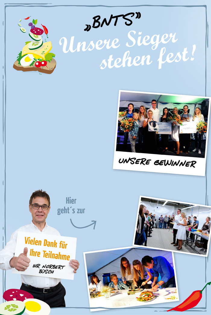 Am Ende konnte es aber nur drei Sieger geben. Wir gratulieren Daniela Keßler mit der Sportsweltstulle, die als Siegprämie einen Vorwerk Thermomix mit nach Hause nehmen konnte. Auf den Zweitplatzierten Tobias Guré der die Gourmee Sattmacherstulle kreierte, wartet eine Einladung zu einem Sommelier-Abend mit 15 Freunden und Norbert Büsch als Gastgeber. Auf den 3. Platz hat es Jennifer Loosen mit Ihrem Gartenferkel geschafft. Sie gewann ein kulinarisches-Wochenende im Landhotel Voshövel in Schermbeck.