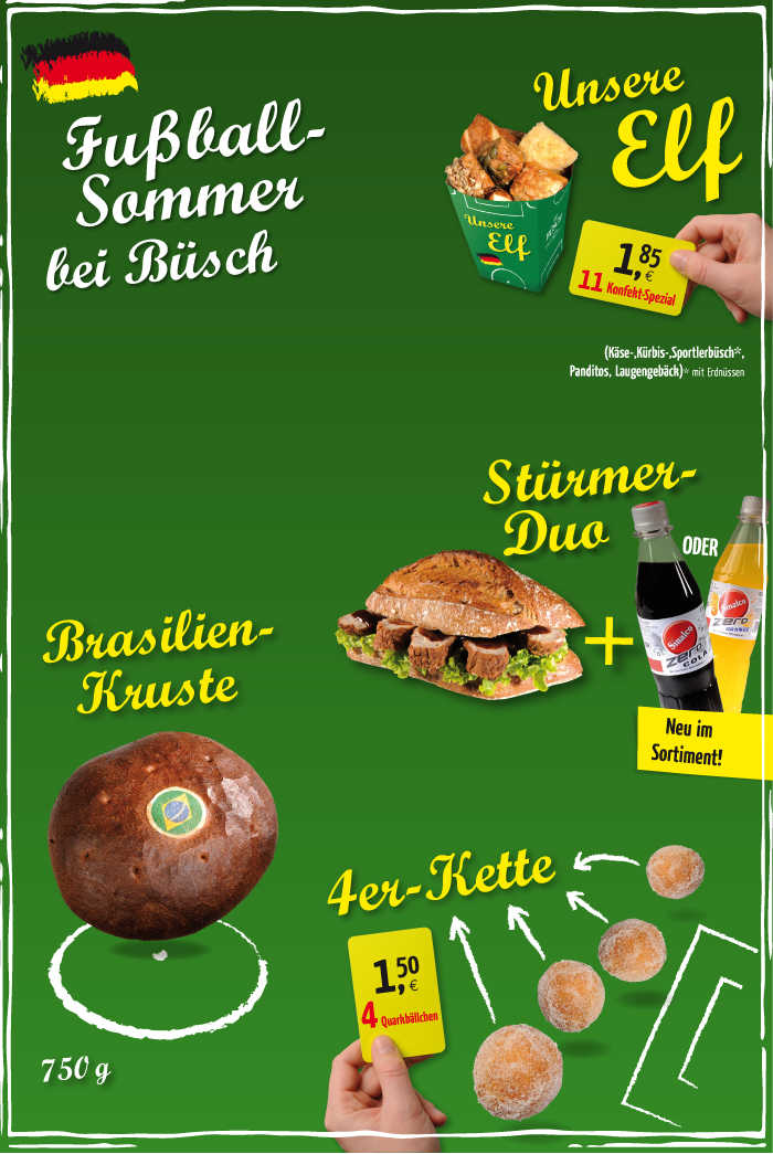 Zur WM kannst Du Dir Deine eigene Büsch-Mannschaft aufstellen! Als Stürmer empfehlen wir Dir unseren „Lecker-Snacker“ – am besten im unschlagbaren Duo mit einer Sinalco Zero. Wenn Du taktisch auf eine starke Abwehr setzt, solltest Du unbedingt unsere 4er-Kette aus feinen Quarkbällchen probieren. Und mit „unserer Elf“, elf Spezial-Konfekten in dekorativer Box, kannst Du gleich eine ganze Mannschaft versorgen. Passend dazu gibt‘s unser aktuelles Monatsbrot „Brasilienkruste“ mit Oblate in Farbe und Form einer Brasilien-Flagge.