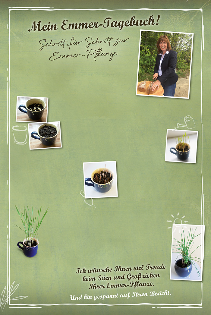 Mein Name ist Annett Swoboda. Ich bin Marketingleiterin bei der Bäckerei Büsch. Auch wir waren sehr gespannt, wie aus dem Emmer-Korn eine Pflanze wird. Deshalb haben wir einen Selbstversuch in unserem Büro gestartet.