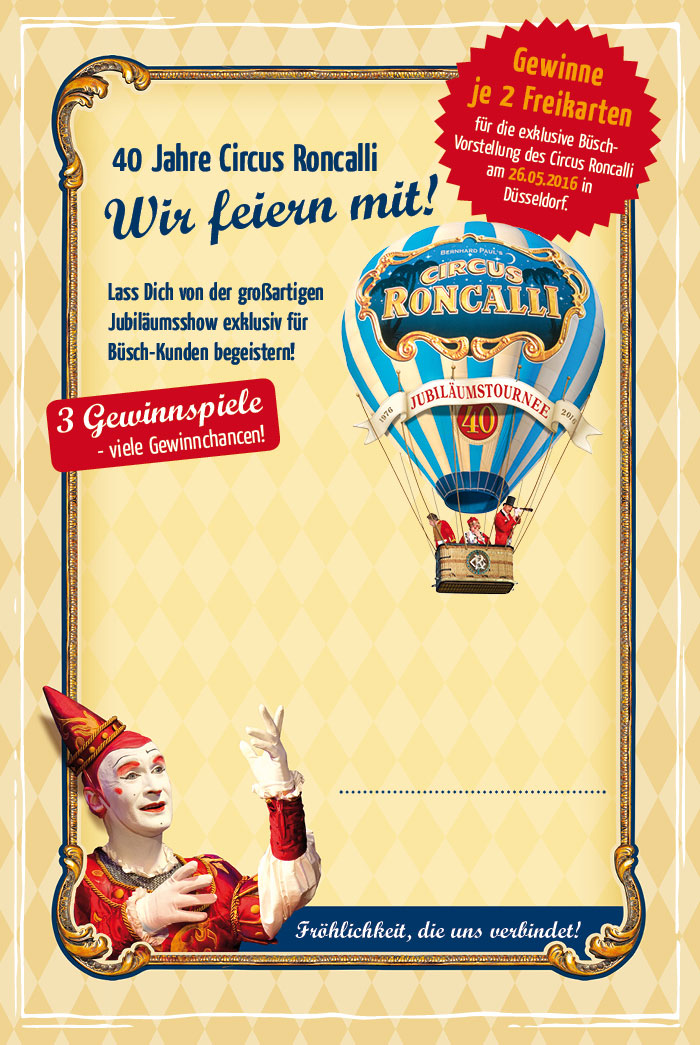 Mit Deiner Teilnahme an den Gewinnspielen hast Du die Chance auf jeweils 2 Freikarten für die exklusive Büsch-Vorstellung des Circus Roncalli. Diese Vorstellung ist ausschließlich für Büsch- Kunden reserviert!