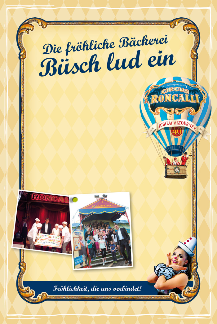 - zum 40-jährigen Roncalli-Jubiläums am 18.05.16, in Köln überraschte Büsch mit einer Geburtstagstorte für 1.500 Besucher und Artisten,