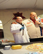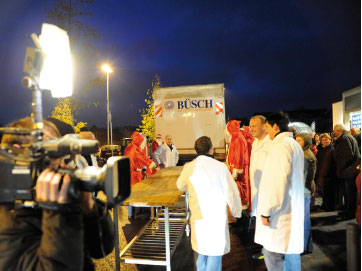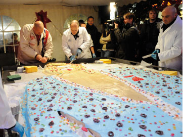 Auch der Transport erforderte starke Mitarbeiter: Das nötige Backblech war einen Meter länger als der längste Rolls Royce und musste von einem Dutzend Mitarbeitern getragen werden. Angebissen werden durfte die süße Sonya da allerdings noch nicht: Dieses Vergnügen war den Hunderten von Edeka-Besuchern vorbehalten, die jeweils ein Stück vom süßen Glück vernaschen durften und für die umliegenden Kindergärten einen Beitrag spendeten.